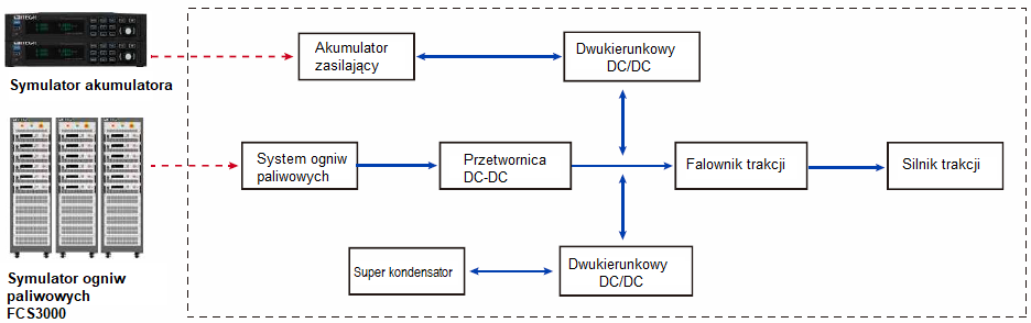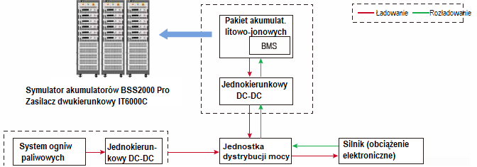 | Cel testu: Prace naukowo-badawcze nad dystrybucja energii systemów zasilania pojazdu szynowego energią pozyskiwaną z wodoru Rozwiązanie firmy ITECH: oprogramowanie BSS2000 Pro plus zasilacz dwukierunkowy DC serii IT6000C lub IT6000B Zalety: - definiowanie przez użytkownika krzywych charakterystycznych akumulatora - obsługa importu plików formatu .mat, wygodnych pracach naukowo-badawczych prowadzonych nad własnościami akumulatorami nowych typów stosowanych w systemach napędowych - wyświetlanie w czasie rzeczywistym napięcia akumulatora, prądu, pojemności, energii i stanu naładowania (SoC) |