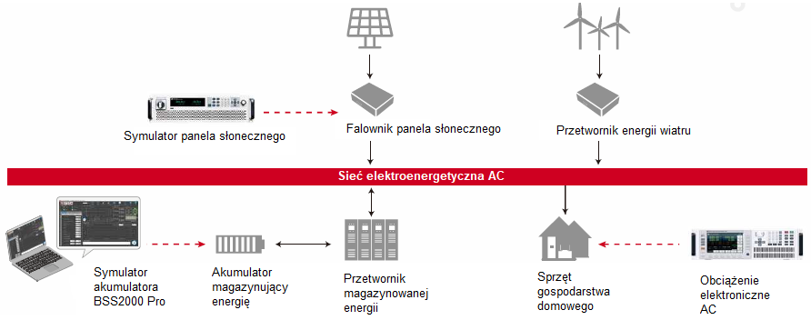 | Cel testu: zweryfikowanie wartości parametrów elektrycznych systemu sterowania mocą przetwornika zmagazynowanej energii Rozwiązanie firmy ITECH: oprogramowanie BSS2000 Pro plus zasilacz dwukierunkowy DC serii IT6000C lub IT6000B Zalety: - maksymalna moc symulatora akumulatora równa 1152 kW - obsługa wielu typów akumulatorów (do wyboru), w tym litowych, kwasowo-ołowiowych i innych |
