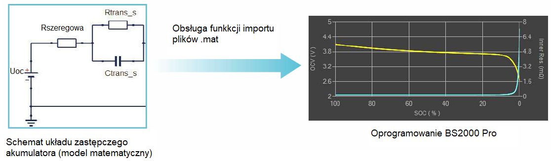Oprogramowanie symulacyjne BSS2000Pro i BS2000M zapewnia profesjonalnym naukowcom w dziedzinie akumulatorów funkcję importowania plików matematycznych (.mat), dzięki czemu mogą oni symulować odpowiednie krzywe charakterystyczne modeli matematycznych różnych akumulatorów. Funkcja ta ma ogromne znaczenie w pracach naukowych nad adaptowalnością nowych akumulatorów i produktów, a także nad zastosowaniami konwencjonalnych akumulatorów w specjalnych otoczeniach. Krzywe charakterystyczne akumulatorów konwencjonalnych typów lub modele matematyczne bazują zwykle na warunkach typowych, lecz dla nowych akumulatorów lub aplikacji w otoczeniach specjalnych konstruktorzy potrzebują często budować nowe modele akumulatorów, aby w sposób bardziej realistyczny odzwierciedlić własności tych akumulatorów w specyficznych kontekstach aplikacyjnych. Wymieniona funkcja została opracowana specjalnie do takich zastosowań. Użytkownik może do celów symulacji zbudować model matematyczny nowego akumulatora za pomocą platformy symulacyjnej MATLAB* strony trzeciej i zaimportować plik .mat do programu BSS2000 Pro lub BSS2000M, a następnie zweryfikować adaptacyjność w aplikacjach praktycznych.
