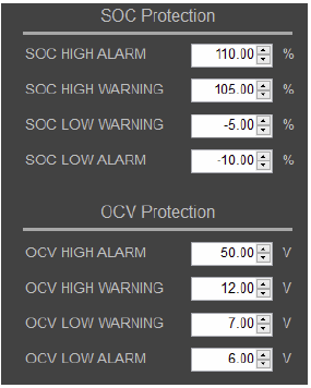 | W zastosowaniach praktycznych, aby przedłużyć serwisowy czas życia akumulatora i uchronić go przed przed przeładowaniem i nadmiernym rozładowaniem, system zarządzania akumulatorem (BMS) umieszony w pakiecie akumulatorów ograniczy w różnych aplikacjach przedział bezpieczeństwa akumulatora. Gdy zostanie przekroczona w górę lub w dół wartość graniczna ochrony, to oprogramowanie przerywa natychmiast obwód, aby chronić zarówno akumulator, jak i testowany obiekt. Oprogramowanie symulacyjne (w wersjach BSS2000, BSS2000 Pro i BSS2000M) obsługuje wiele różnych ustawień warunków ochrony: wartości alarmowej górnej i dolnej stanu naładowania akumulatora (SoC), wartości górnej i dolnej ochrony stanu SoC, wartości alarmowej górnej i dolnej napięcia w stanie przeładowania akumulatora (OCV) i wartości górnej i dolnej ochrony w stanie OCV. | ![]() |
