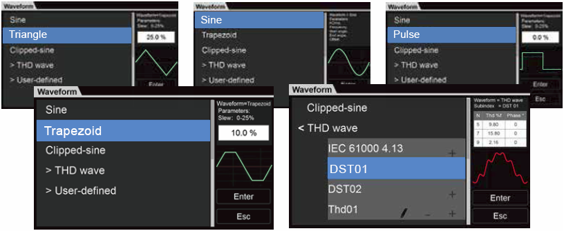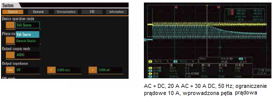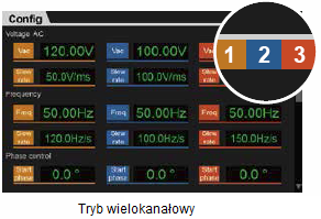 • Możliwość wyboru trybu wyprowadzania jednofazowego, trójfazowego, z odwrotną kolejnością faz, aby symulować asymetrię sygnału trójfazowego, asymetrię harmonicznych trójfazowych, test podziału faz sygnału trójfazowego, testy faz o kolejności odwrotnej w wersjach trójfazowych zasilaczy, itd. *3