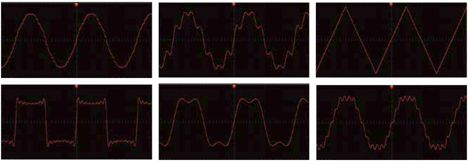W drugim rzędzie kolejno: przebieg stały o napięciu 50 V z nałożonymi sinusoidalnymi tętnieniami o napięciu 5 V i częstotliwości 1000 Hz; przebieg stały o napięciu 50 V z nałożonym przebiegiem tętnień o kształcie prostokątnym, napięciu równym 5 V i częstotliwości 1000 Hz; przebieg stały o napięciu 50 V z nałożonym przebiegiem tętnień o kształcie trójkątnym o napięciu równym 5 V i częstotliwości 1000 Hz