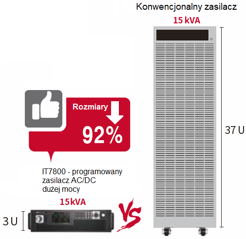 | Duża gęstość mocy równa 15 kVA/3U Przy rozmiarach 3U zasilacze serii IT7800 mogą dostarczać napięcie przemienne wynoszące w sieciach L-N do 350 V, a ich moc wyjściowa może osiągnąć nawet 15 kVA. W porównaniu z konwencjonalnym źródłem zasilania AC przyrządy te pozwalają swoim użytkownikom zaoszczędzić dużo przestrzeni w miejscu pracy. |