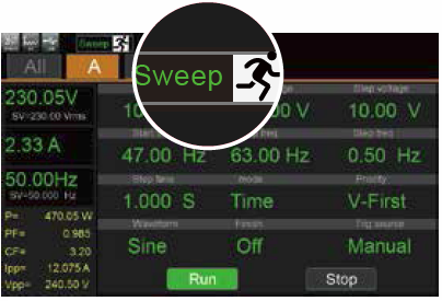 | Przemiatanie Funkcji przemiatania można używać do testowania sprawności zasilacza impulsowego i pobierania napięcia oraz częstotliwości w punktach mocy maksymalnej. Użytkownik może ustawiać wartości napięć startu, stopu i kroku, częstotliwości startu, stopu i kroku oraz czasu pojedynczego kroku tak, aby napięcie i częstotliwość zasilania sygnału wyprowadzanego w trakcie testu była zmieniana skokowo. Na koniec testu można wyświetlić dane punktu mocy maksymalnej. |