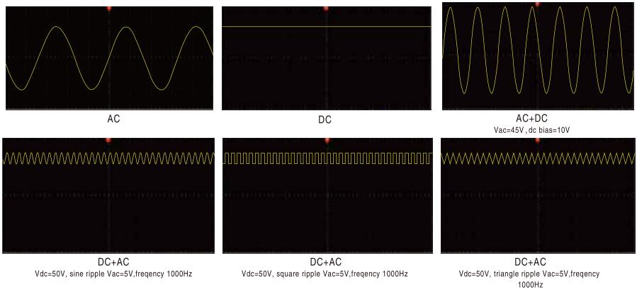 Użytkownik zasilacza serii IT7800 ma do dyspozycji cztery tryby wyprowadzania sygnału: AC, DC, AC+DC i DC+AC. Tryby te służą do realizacji zadań wyprowadzania "sygnału przemiennego AC z nałożoną polaryzacją DC" lub "sygnału stałego DC z nałożonymi tętnieniami AC", które pokrywają szeroki zakres zastosowań pomiarowych.